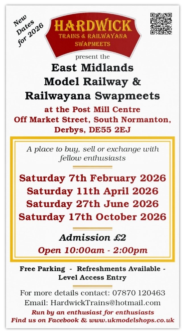 | 7 February 2026 | Hardwick Model Trains & Railwayana Swapmeet (South Normanton, DE55 2EJ) [Further details 07870-120463] |